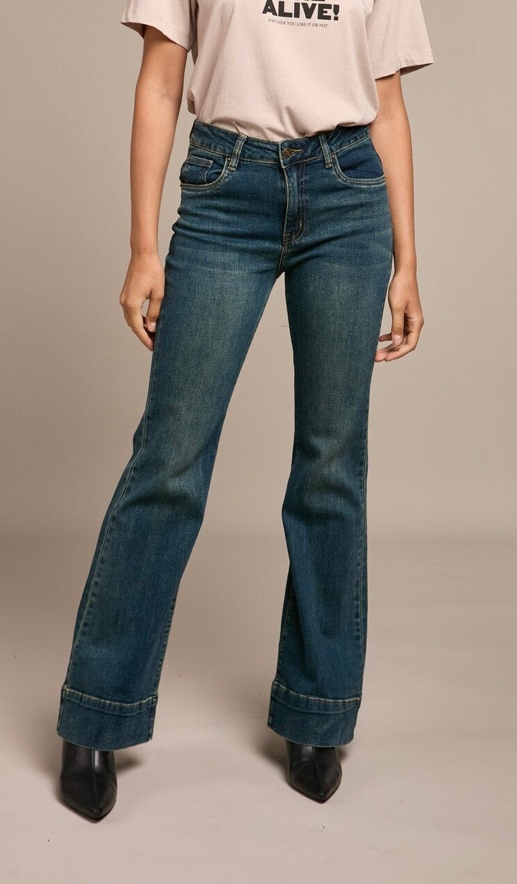 De bootcut jeans is licht uitlopend vanaf de knie en heeft een zeer retro stijl.